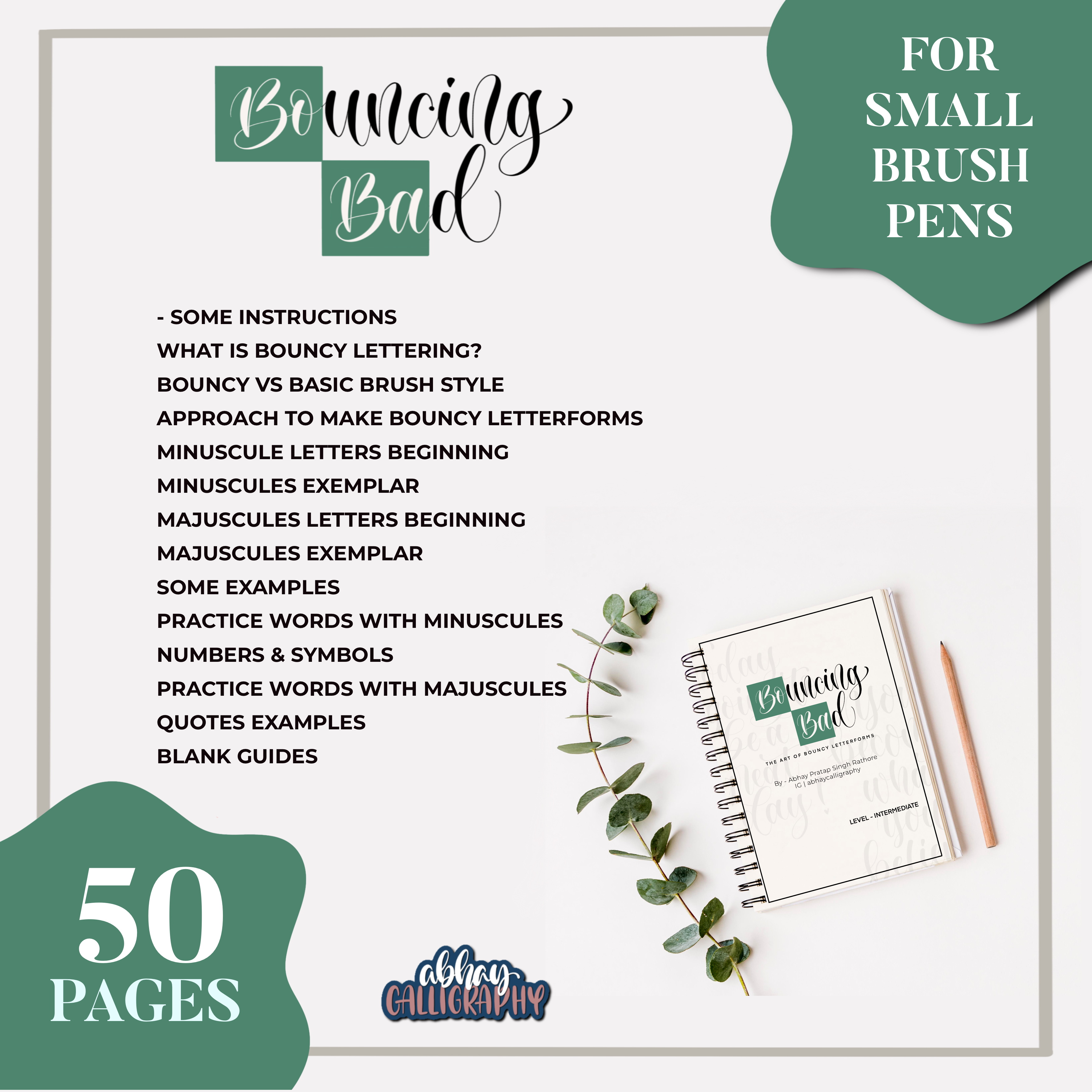 Bouncing Bad is latest addition to my E- Workbook collection and it contains everything you need to know to make Bouncy Letterforms. As you may already know, I love this variation of brush style because of its free flowing and playfulness. Because of this playfulness, this is also sometimes referred as ‘Dancing Letters’.